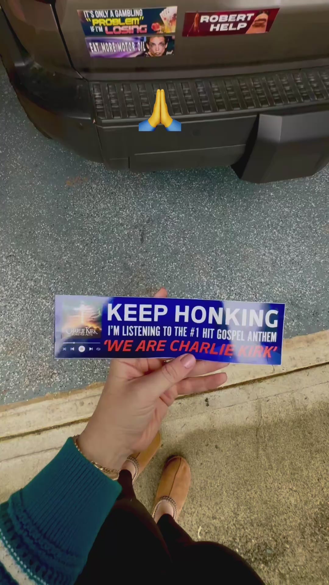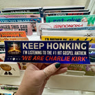 “KEEP HONKING — I’m listening to the #1 hit gospel anthem ‘WE ARE CHARLIE KIRK’” is not merely a sticker.